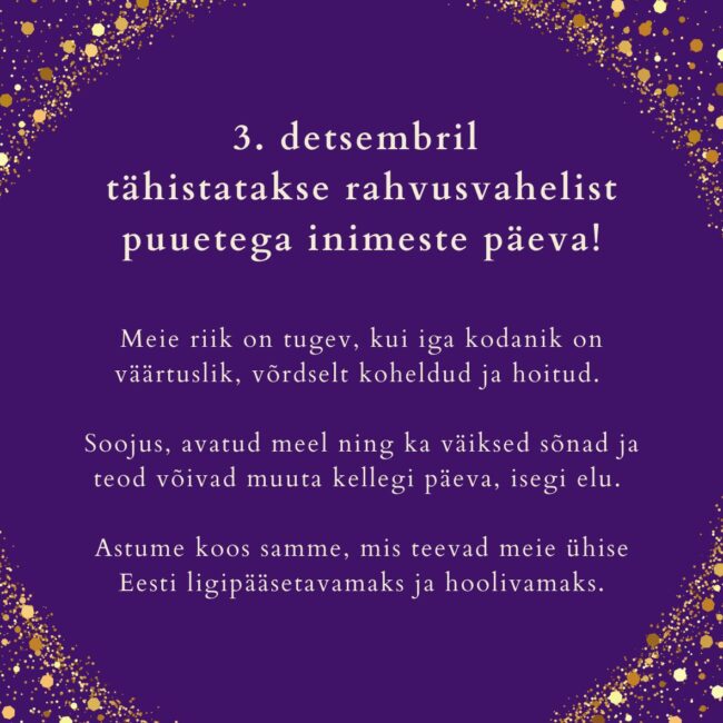 3. detsembril tähistatakse rahvusvahelist puuetega inimeste päeva!